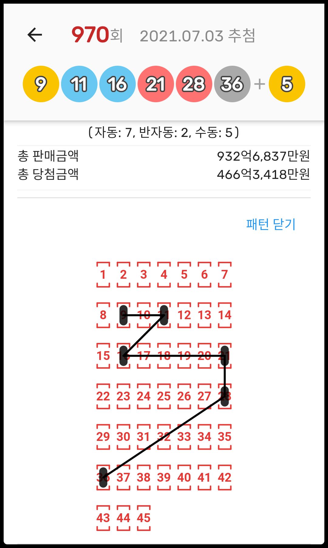 당첨번호 : 9, 11, 16, 21, 28, 36 (보너스: 5)