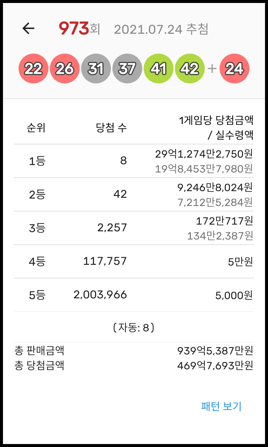 당첨번호 : 22, 26, 31, 37, 41, 42 (보너스: 24)